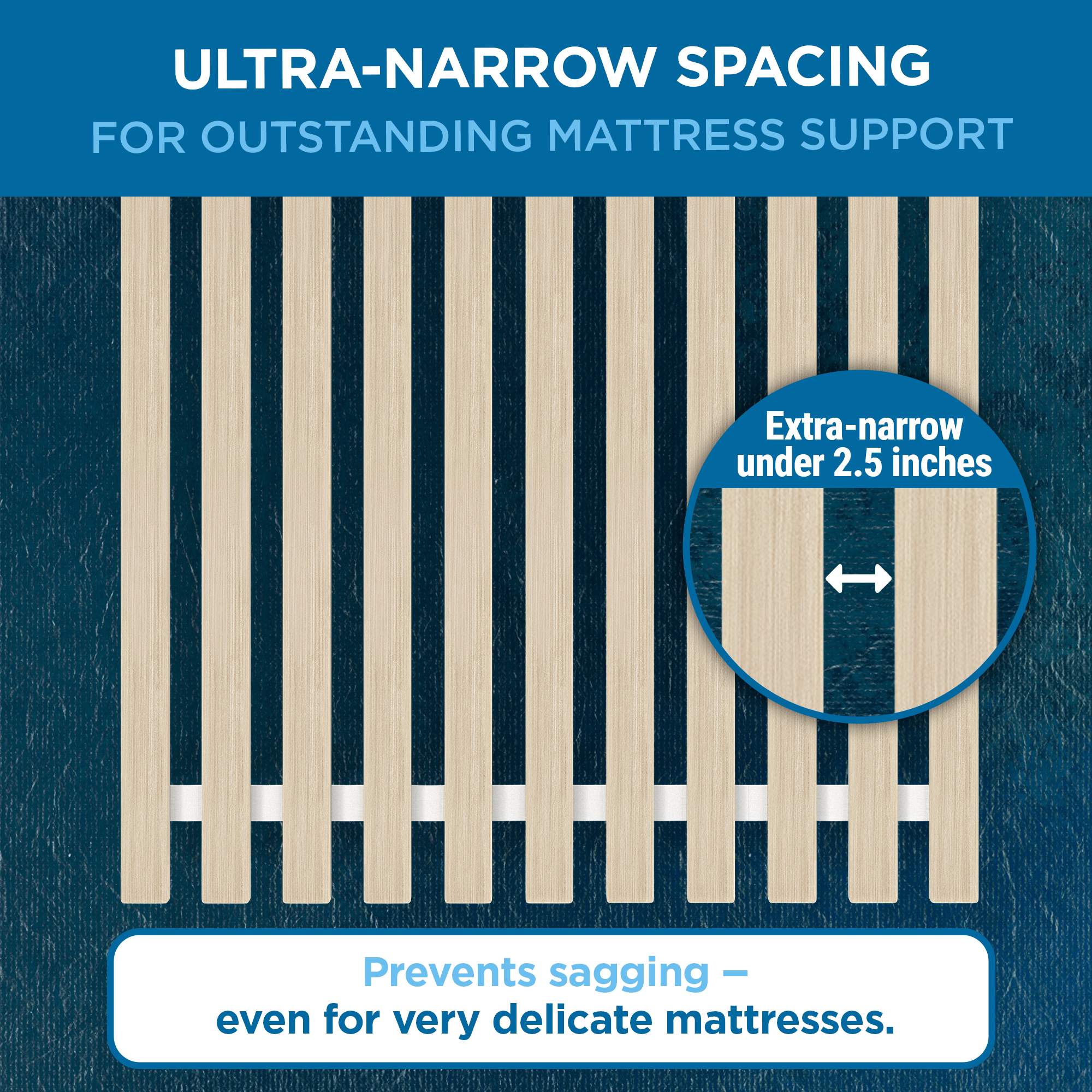 Compatible With Every Mattress Type - While typical supports leave 4–5 inch gaps, SlatSure’s ultra-narrow <2.5 inch spacing provides continuous, even support from edge to edge. This tight spacing safely supports delicate memory foam, latex, and hybrid mattresses without compromising airflow or breathability.